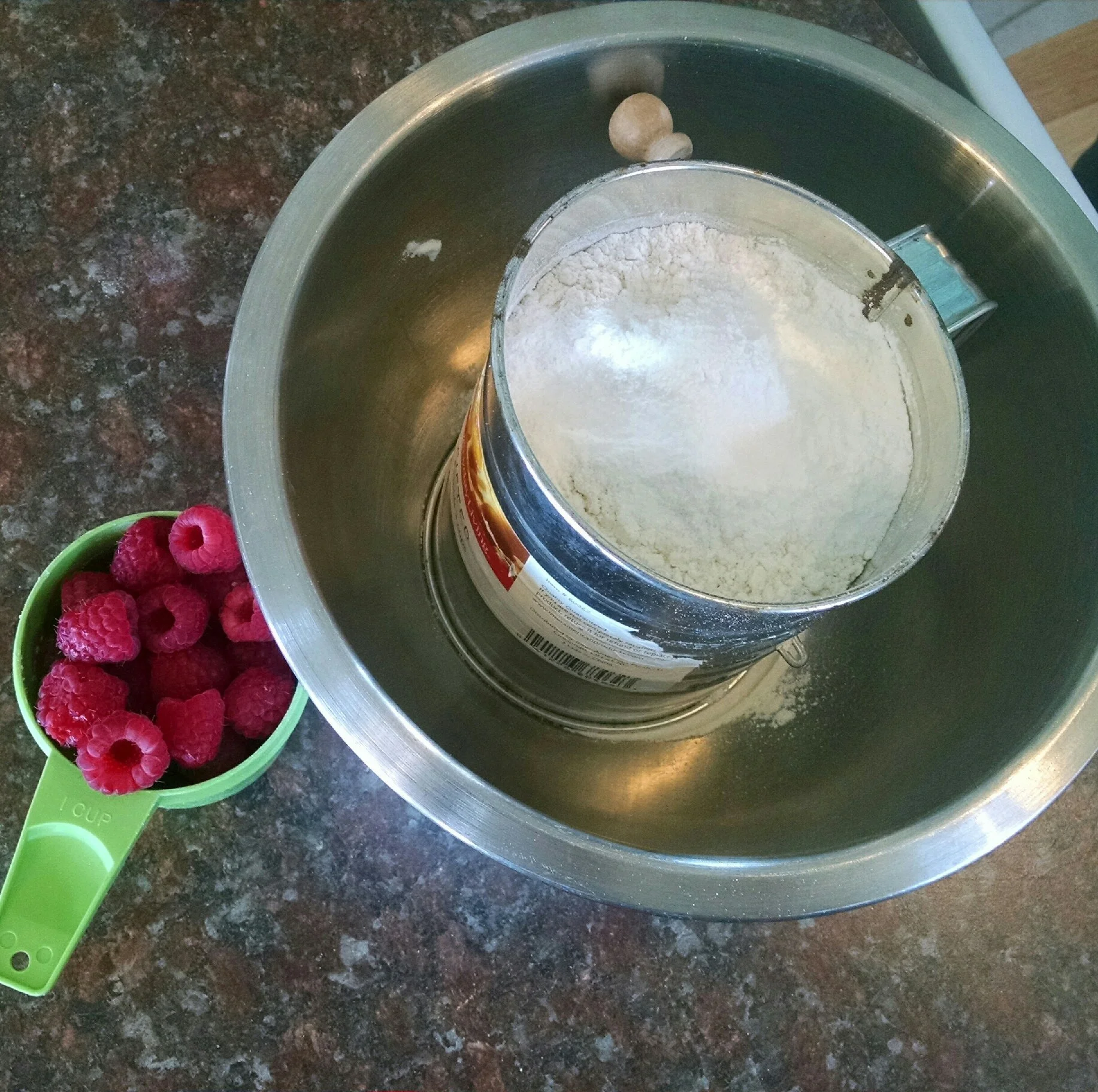 Here are the ingredients you will need to gather. Flour: 2 1/2 cups. Butter: 2/3 cup, cubed. Now, the very important key to this recipe is to keep the butter cold. Get it out of the fridge, measure and chop it up, and put it back in the fridge until the moment you need to mix it into the bowl. Baking powder: 4 teaspoons. Salt: 1/2 teaspoon. Sugar: 1/4 cup. Heavy cream: 1 1/4 cups. Chopped fresh berries: 1 generous cup.