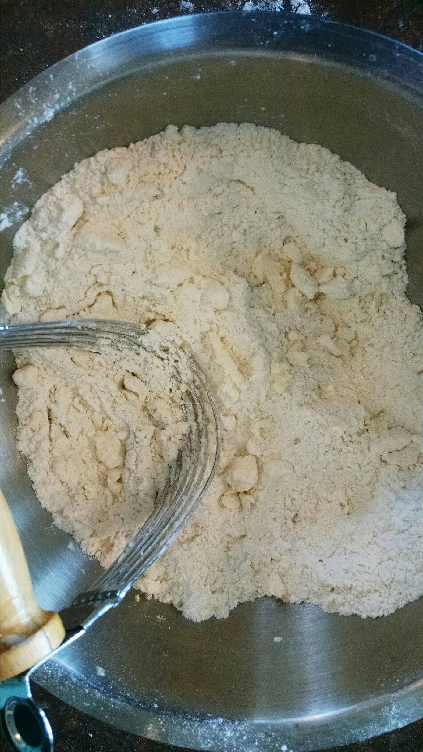 Now you are ready to cut in your butter. Go ahead and get it out of the fridge and scrape the pieces into the bowl. Using a pastry blender, or a knife and fork if you don't have one, start cutting and mixing the butter into the flour until it looks like little pebbles. It should only take a few minutes.