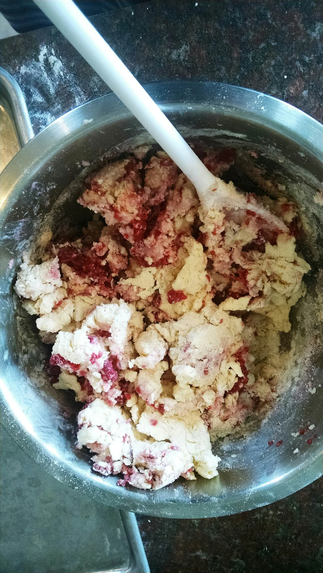 Pour in the cream, a little at a time, moistening the flour with a fork until it is all gently incorporated. Fold in the fruit gently, being careful not to crush it or overmix the dough. It will be stiff. If there is a lot of flour at the bottom of the bowl, you can pour a few more drops of cream onto it to moisten it.